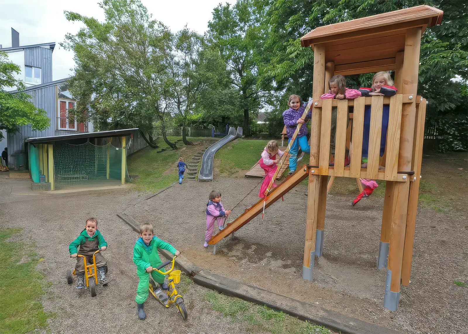 Auch draußen gibt es viel zu entdecken: Der eingezäunte Außenbereich bietet Spiel- und Klettergeräte, einen überdachten Sandkasten, eine Pflasterfläche für Fahrzeuge und eine kleine Wiese, zum Beispiel zum Fußballspielen.