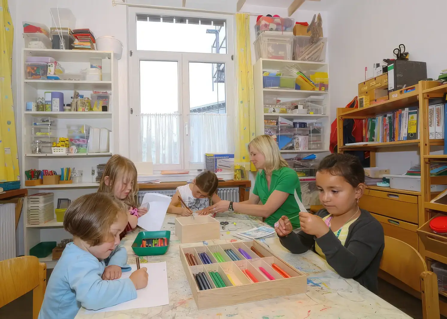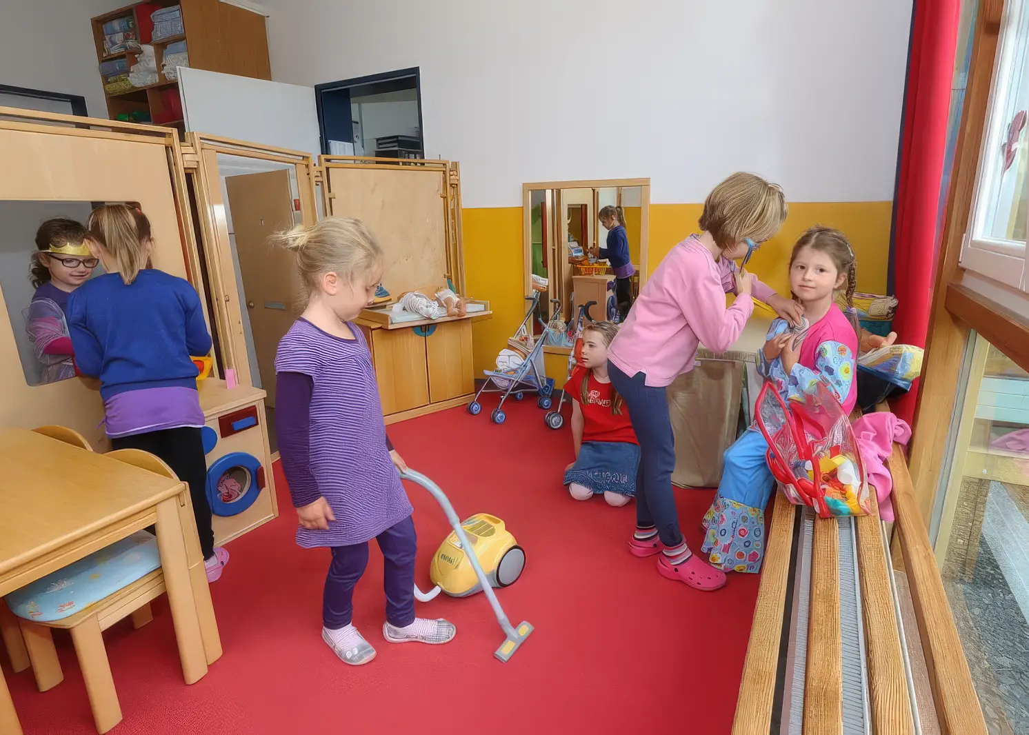 Unsere Kita verteilt sich über drei Etagen. Die hell und freundlich gestalteten Gruppenräume laden die Kinder zum Spielen, Ausprobieren und Entdecken ein. Jede Gruppe verfügt über einen Nebenraum mit Küchenzeile sowie einen eigenen Waschraum.