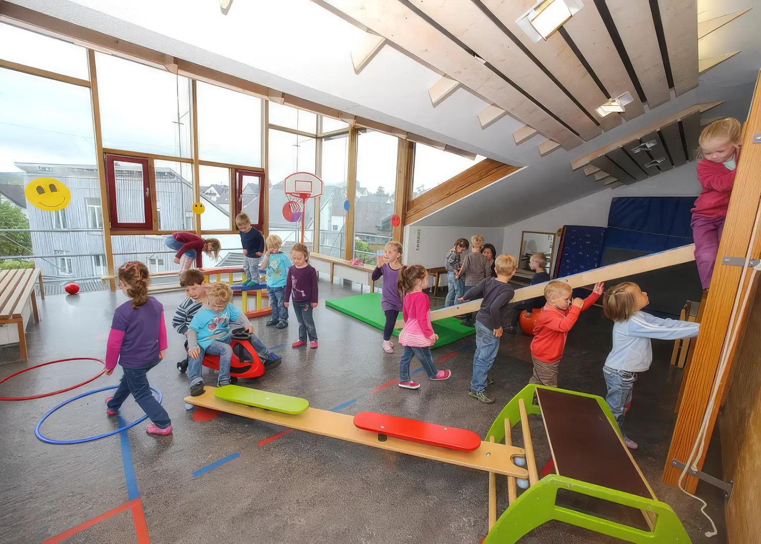 Die U3-Gruppe ist zusätzlich mit einem Schlafraum und einem Wickelbereich ausgestattet. Weitere Spiel- und Bewegungsmöglichkeiten bieten die Turnhalle sowie der Flurbereich.
